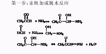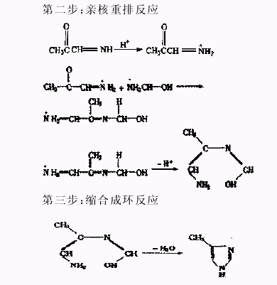 采用丁二酸铵法成本高, 后处理繁琐; 硫酸盐、氨水工艺, 常用甲酸、乙酸和硫酸等调节 pH值, 但反应过程酸度难以控制, 为了保证在整个反应过程中体系始终呈酸性, 并以 pH=2- 4 最佳, 文献对此方法加以改进, 采取提高硫酸铵的浓度(即减少水的用量)并准确测定, 同时调整氨水的加入时间和速度的方法,较好地控制了溶液的 pH值。由于用水量减少, 反应结束后, 反应液中硫酸盐的含量较高, 其盐析作用有利于溶液中 4-MI 被溶剂萃取出来, 达到了简化操作, 提高并稳定收率的目的; 草酸铵法由于草酸铵与反应过程中生成的草酸形成缓冲体系, 反应系统酸度保持稳定, 且草酸盐在水中溶解度低, 4-MI 草酸盐容易从反应液中分离, 也可合成高纯度的 4-MI。国内复旦大学、上海石油化工研究院等报道了以丙酮醛合成4-MI 工艺的研究。目前国内 4-MI 生产主要采用丙酮醛- 草酸铵或丙酮醛- 草酸- 氨工艺, 收率 60%-75%, 产品质量达到国外同类产品指标。其中, 以丙酮醛、甲醛、氨水等为原料合成4-MI 的反应机理如下: