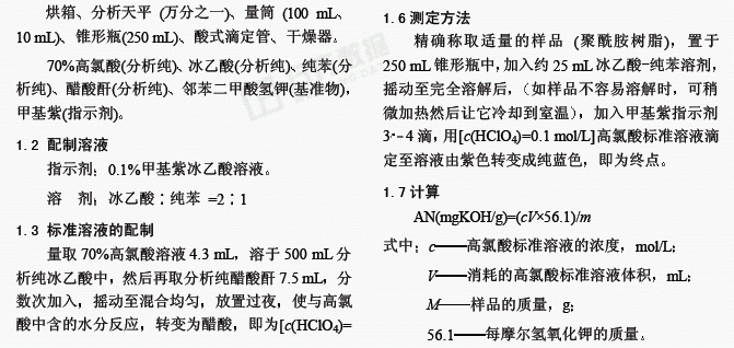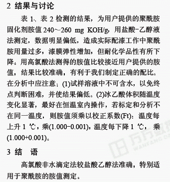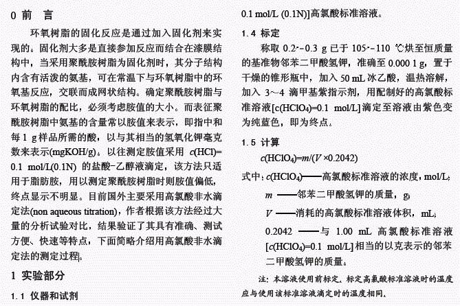 摘 要:介绍了高氯酸非水滴定法标准溶液的配制;试剂选用\测定及计算;目的是提高胺值测定的准确性\科学性. 关键词: 环氧固化剂; 胺值; 测定方法