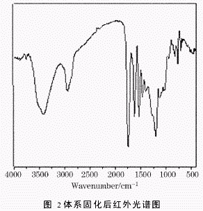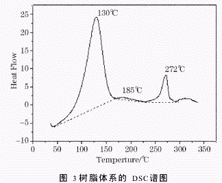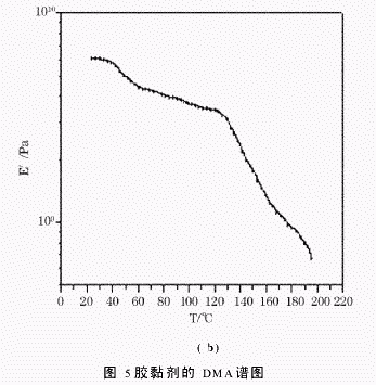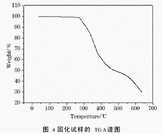 王 超 苏 韬 曲 飚 (1.黑龙江省石油化学研究院,黑龙江哈尔滨150040;2.哈尔滨德科科技发展有限公司,黑龙江哈尔滨150040) 摘要:苯并恶嗪作为一种可以中温固化的,无挥发份产生的耐高温树脂,目前在灌封胶黏剂领域还没有被应用。通过苯并恶嗪改性环氧树脂可以提高其耐热能,并保持原有力学性能。制备了一种苯并恶嗪改性环氧树脂灌封胶黏剂。采用红外光谱研究了其固化前后的结构变化,采用差热分析法对其固化行为进行了分析,通过热重法和动态黏弹法研究了其耐热性能。胶黏剂力学性能研究结果表明该体系在130℃固化5h,具有良好的耐热性和力学性能。 关键词:苯并恶嗪;环氧树脂;胶黏剂 中图分类号:TQ433.437 文献标识码:A 文章编号:1001-0017(2007)01-0001-04 前 言 苯并恶嗪是含有碳、氮六元杂环的新型树脂。此类化合物是Holly和Cope在1944年进行Man nich反应产物中意外发现的。苯并恶嗪树脂不仅继承了传统酚醛树脂的优异性能,而且开环固化无需催化剂,无低分子放出,收缩小或无收缩。苯并恶嗪不仅可以通过加热进行开环自聚合形成高分子化合物,也可以和环氧、酚醛进行加热共聚合形成高分子化合物。克服了传统酚醛树脂固化时释放出大量小分子挥发份,而以强酸做催化剂时则会严重影响其耐热性能和力学性能等缺点。 近来,Ishida等人合成了多种苯并恶嗪,对其性能进行了研究,还发明了无溶剂体系合成苯并恶嗪的方法。四川大学的顾宜等人,发明了以水为介质,采用悬浮造粒合成粒状苯并恶嗪单体的方法,并制备了RTM用苯并恶嗪树脂,此外还对苯并恶嗪-环氧化合物在催化条件下开环聚合的机理进行了研究。 苯并恶嗪改性环氧树脂可以提高环氧树脂固化体系的耐热性能和耐热老化性能。但是苯并恶嗪在耐高温灌封胶黏剂的应用至今还没有文献报道。本文采用苯胺、甲醛和苯酚制备的单环苯并恶嗪,并以此改性环氧树脂制备了灌封胶黏剂,并对其结构、耐热性能和力学性能进行了研究。表明这种灌封胶黏剂具有较低的固化温度、良好的耐热性能和力学性能。 1 实验部分 1.1原料 苯胺:天津市科密欧化学试剂开发中心,甲醛:莱阳市双双化工有限公司,苯酚:莱阳市双双化工有限公司,TDE-85环氧树脂:工业品,间苯二氨:天津市光复精细化工研究所,4,4′-二氨基二苯甲烷:上海科帆化工科技有限公司。 1.2分析与测试 红外分析:使用VECTOR22傅立叶红外光谱仪。样品红外透射光谱为每个样品扫描32遍,扫描范围4000cm-1到400cm-1,采用KBr压片,样品约为5mg,KBr约为200mg。 差热分析:使用PE公司DSC7,氮气环境下升温速率:10℃/min,扫描温度范围:室温到350℃。 热重分析:使用PE公司TGA7,氮气环境下升温速率:10℃/min,扫描温度范围:室温到650℃。 动态黏弹谱图分析:使用METRAVIBMAK-04VISCOANALYSER动态黏弹谱仪,频率11Hz,升温速率:3℃/min,室温到200℃,试样尺寸:30mm×4mm×6mm。 力学性能:拉伸强度依照国标GB2568-81进行测试,冲击强度按照国标GB2571-81进行测试。 1.3苯并恶嗪的制备 在配备搅拌器冷凝回流装置的三口烧瓶中加入100ml苯胺,150g甲醛和100g苯酚,加热至95℃恒温1h。减压蒸馏得到苯并恶嗪。 1.4固化剂的配制 将间苯二氨和4,4′-二氨基二苯甲烷按照质量比3∶2的比例熔融混合均匀,得到本体系使用的芳胺类固化剂。 1.5苯并恶嗪改性环氧树脂灌封胶黏剂的制备 将自制苯并恶嗪、TDE-85环氧树脂、芳胺类固化剂按比例混合均匀,固化条件为:50℃/2h+130℃/5h。 2 结果与讨论 2.1苯并恶嗪改性环氧树脂灌封胶黏剂固化前后的红外光谱图分析 苯并恶嗪改性环氧树脂灌封胶黏剂固化前后的红外光谱图如图1和图2所示: 从图1苯并恶嗪固化前的红外谱图可见,908cm-1为环氧基团的特征峰;948cm-1为恶嗪环的特征峰,由于苯并恶嗪的含量较低因此该特征峰较弱;3350cm-1为氨基特征峰,3500cm-1为羟基特征峰,3040cm-1为甲基特征峰,2925cm-1为亚甲基特征峰;1031cm-1为C-O-C的特征峰;1200cm-1为C-N-C的特征峰;1619cm-1、1505cm-1为苯环上C-C骨架振动的特征峰。从图2苯并恶嗪固化后的红外谱图可见,908cm-1环氧基的特征峰、948cm-1恶嗪环的特征峰和3350cm-1胺基特征峰消失,表明固化过程中环氧基、恶嗪环和氨基都参与了固化反应。 2.2苯并恶嗪改性环氧树脂灌封胶黏剂固化条件的确定 苯并恶嗪改性环氧树脂灌封胶黏剂的DSC谱图如图3所示: 由图3可见,灌封胶体系在50℃时开始放热,并在130℃时放热达到峰值,165℃放热结束。在此温度范围内体系中苯并恶嗪、环氧树脂和胺类固化剂之间发生聚和反应。此外灌封胶体系在185℃出现微弱放热峰,此放热现象的出现是前期固化不完全而残留的苯并恶嗪在受热开环聚合造成的。在272℃处出现的放热峰,是树脂体系开始发生分解产生。因此本文选择的固化条件为:50℃/2h+130℃5h。 2.3苯并恶嗪改性环氧树脂灌封胶黏剂耐热性能的研究 苯并恶嗪改性环氧树脂灌封胶黏剂的TG谱图和DMA谱图分别如图4、5所示: 由图4可见,此体系的固化产物在272℃时出现热失重,主要原因是其结构中的羟基、甲基、亚甲基等非耐热性基团开始分解致使体系发生热失重。随着温度的升高,胶黏剂体系剧烈失重,这是由于胶黏剂中耐热性较差的环氧树脂固化体系发生热分解造成的。当温度达到436℃时热失重趋势变缓,此时胶黏剂结构中耐热性能优异苯并恶嗪的开始发生热分解,由于其耐热性能优于环氧树脂固化体系,因此热失重趋势变缓。当