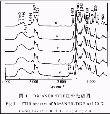 PerkinElmerPyris1差示扫描量热仪(美国),升温速率分别为5、75、10、125和15℃/min;NicoletNexus670型傅里叶红外光谱仪(美国)。将bisANER/DDE样品溶解在四氢呋喃中,然后将溶液涂在KBr压片上,脱除溶剂后进行红外扫描,之后将同一KBr片在170℃固化,并于不同时间取出对其进行红外光谱扫描。将涂有bisANER/DDE样品的KBr片在170℃固化8h,在加热炉内以10℃/min的速率升温,在不同温度时取出样品对其进行红外光谱扫描;NetzschSTA449CTGDSC同时测定仪(德国),升温速率为10℃/min。将bisANER/DDE在170℃固化8h,然后分别在N2气和O2气气氛下进行热重分析,气体流速20mL/min。