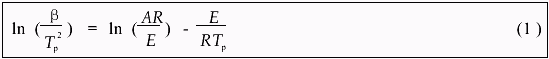 式中,β为线性升温速率(℃/min),A为指前因子,E为活化能(J/mol),R为普适气体常数(8314J/mol),Tp为峰温(℃),以ln(β/T2p)对1/Tp作图可以得到E和A值。