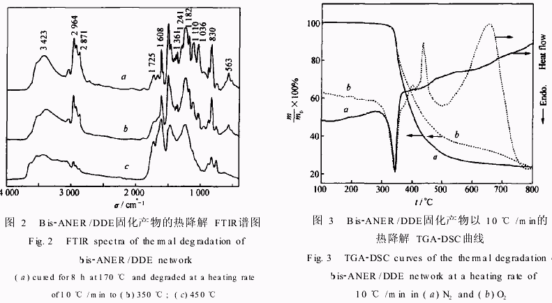 图3分别为bisANER/DDE固化产物的热降解TGA和DSC曲线。由图中TGA曲线可见,热降解起始温度在315℃,在热降解的起始反应阶段(310~347℃,质量损失约13%)N2气和O2气气氛中的TGA曲线相似,且2种气氛下的DSC曲线上均出现为1个吸热峰。与图2比较可知,此过程主要涉及醚键的断裂,还有部分羟基、饱和C—H的脱离。当温度升高后,气氛对热降解反应的影响比较明显,在相同热降解温度时,N2气气氛中的质量损失较O2气气氛中的为大,直到热降解末期。对应这一过程的2种气氛的DSC曲线差别也较大,在O2气中有2个放热峰,而在N2气气氛中则没有明显的放热峰,表明O2气在热降解过程中参与了反应,使得某些官能团被氧化,从而导致bisANER/DDE固化产物热降解过程中的质量损失比在相同温度的N2气中的小,而在N2气中的热降解主要是化学键的断裂。