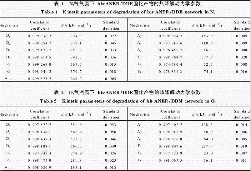 由所列数据的分析比较可以确定,bisANER/DDE固化产物在N2气和O2气气氛中热降解反应机理均为A1.5模式,即g(α)=[-ln(1-α)]2/3的核增长模式,热降解活化能分别为2487和1881kJ/mol。