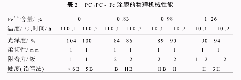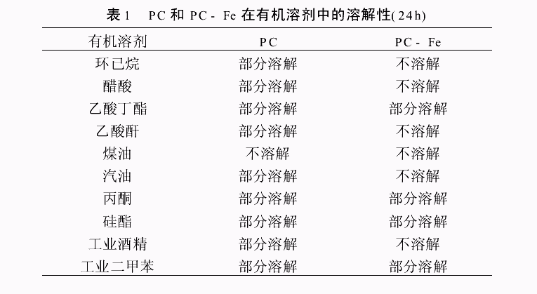 2.2 PC和PC-Fe的溶解性 在110℃烘烤1h的PC和PC-Fe膜分别浸泡于有机溶剂,24h后溶解性结果如表1所示。从表1可以看出,由于Fe3+与PC分子链间的配位作用,生成的PC-Fe交联度较大,因而更难于溶解于有机溶剂。 2.3 PC和PC-Fe的物理机械性能