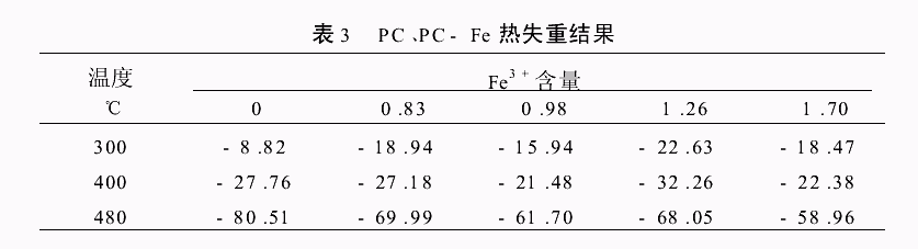 表2是PC和PC-Fe涂膜的部分常规物理机械性能测试结果。从表2可以看出,PC配位一定量金属离子Fe3+后,具有较好的物理机械性能,特别是硬度大为改善。烘烤1h与2h的PC-Fe膜相比较,光泽度、附着力、柔韧性基本不变,但硬度增加。 2.4 PC和PC-Fe的热重分析