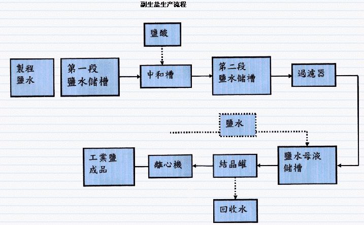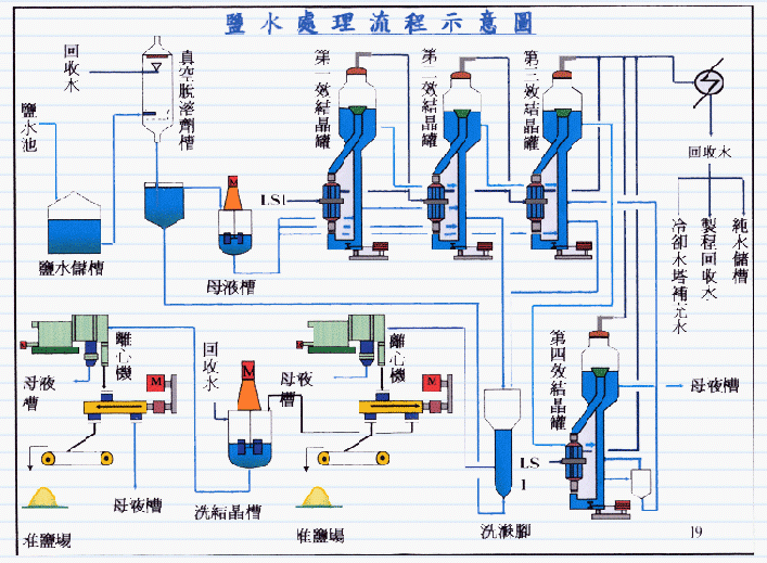 一、工业盐生产简介: 环氧树脂厂於环氧树脂生产过程中,除了生产环氧树脂外,同时也会产出氯化纳,并透过制程研究、设备改良,如蒸馏、结晶、离心、乾燥等步骤来纯化,并去除杂质,产制粉状工业盐,而所合氯化纳纯度(不含水)达99.7%以上,符合工业盐标准。同时应用於各工厂染整、软水制造再生、水处理等用途,效果良好,其品质足供染整、皮革、水处理等相关工业用途使用。 二、盐水产生: 1.环氧树脂主要原料是环氧氯丙烷(EcH)、丙二酚、触媒氢 氧化钠(NaOH),经预反应槽、主反应槽进行反应,反应过 程中,ECH所含之C1与触媒NaOH所含之Na反应产生氯化钠(盐) 2.反应后,含盐之液态树脂经由真空脱ECH段将残留ECH脱 除。ECH脱除後,再短精制脱盐段加纯水将晶盐洗出,并分液至盐水槽,待制工业盐设备处理。 三、工业盐制造流程: (见附件) 工业盐制造流程主要分为三大部分:盐水前处理段、中和段、结晶罐系统。 1.盐水前处理段: 将盐水於单蒸馏槽加热至100℃,送真空脱溶剖设备(100Torr、100℃),将其中所含溶剖及部份水脱除,送盐水池暂存,盐水浓度23%。 中和段: 盐水经中和槽使用32%盐酸,中和盐水中残留之Na0H,将pU值降为9.5~10,经叶式过滤器过滤杂质,存於盐水池。 结晶罐系统: 盐水先经真空脱溶剂设备(54℃),再次将其中残馀之微量溶剖及部份水脱除,储存於结晶罐入料暂存槽,然後再利用四效结晶罐,逐步将盐水浓缩,当比重达到设定值,即送至第一段推排式离心机,将晶盐脱出後,送至再洗结晶槽,洗净後再送至第二段离心机脱水,脱水後之成品则送至干燥机干燥(水份0.3%↓)。 四效结晶罐主要浓缩盐水中之有机物(甘油、醇类),则送至废液燃烧炉处理。 附件一: