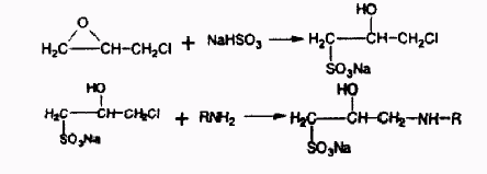 2 1 2將環氧氯丙烷用于兩性皮革加脂劑的制備 兩性离子型皮革加脂劑結构獨特,性能优异,屬于加脂劑中的高檔產品。國內關于兩性皮革加脂劑的研究報道較多[4~6],但用于皮革生產的兩性加脂劑產品則較少。兩性皮革加脂劑与常用的陽离子和陰离子型皮革加脂劑相比具有如下特點:1)配伍性好,可以和陰离子或陽离子皮革化工材料同浴使用;2)耐酸鹼鹽和電解質能力強,可以用于皮革的預加脂,也可用于皮革的主加脂工序;3)兩性加脂劑用于皮革加脂,可以增強加脂革的正電性,有助于酸性染料的吸收,增強皮革表面油感等。環氧氯丙烷用于兩性皮革加脂劑的制備,其主要功能在于在長鏈脂肪胺上引入陰离子基團磺酸根或磷酸根等。因此其制備過程主要分兩步,首先是環氧氯丙烷与亞硫酸氫鈉或磷酸二氫鈉反應得到3 氯 2 羥丙基磺酸鈉或3 氯 2 羥丙基磷酸酯鹽,然后再与長鏈脂肪胺反應得到兩性表面活性劑,通過与其他中性油脂的乳化复配就可以得到兩性皮革加脂劑[7~8]。磺酸鹽型兩性皮革加脂劑的合成示意性反應式如下: