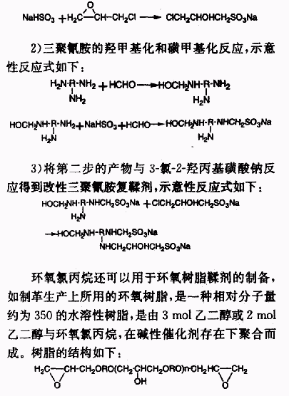 2 3 將環氧氯丙烷用于皮革复鞣劑的制備 氨基樹脂鞣劑對皮革具有良好的复鞣和填充能力,又因其分子中氨基与亞胺基在染色介質中能表現出陽离子性,因而具有一定的助染能力。三聚氰胺樹脂复鞣劑是氨基樹脂复鞣劑中的一种,用其鞣制的革色白、丰滿、緊實、耐光[14],但其存在貯存穩定性差,當其進入皮革內后,在較長時間內會緩慢釋放一定的甲醛,使皮革粒面發脆[15]。針對三聚氰胺存在的問題,蘭云軍等人[16]報道了一种改性三聚氰胺复鞣劑的制備方法,該复鞣劑的制備過程如下: 1)環氧氯丙烷与亞硫酸氫鈉反應得到3-氯-2-羥丙基磺酸鈉,示意性反應式如下: