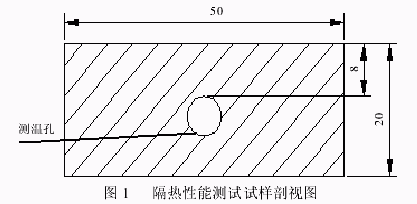 式中 ai —— 不同吸湿时间后样品和称量瓶的总质量(i=5、10、15、20、25 天),g; b —— 吸湿前样品和称量瓶的总质量,g; Ci —— 吸湿率,%; G —— 吸湿前样品的质量,g。 (2)氧指数(LOI) 在 CH-2 型氧指数测定仪上按照 GB/T 2406—1993 测定样品的 LOI 值。 (3)膨胀炭层结构分析 采用 JSV-5900 LV 型扫描电子显微镜分析,取燃烧后的残炭,在样品真空镀膜仪上镀金 30 min,然后在 SEM 仪上用所需放大的倍数观察、摄像, 得残炭结构微观图。 (4)热重(TG)分析 在 Perkin Elmer 热分析仪上进行测试。温度范围 50~750 ℃,升温速率 10 ℃/min,气流速度50 mL/min。 (5)隔热性能 设计如下的方法测试材料的隔热性能。测试样品如图 1 所示。测温孔距离灼烧面 8 mm。将试样上表面放到酒精喷灯上灼烧,观察孔内温度随时间的变化情况。 (6)透光率 用烟箱法测试样品在烧蚀后的红外光透过率、可见光透过率、激光透过率。