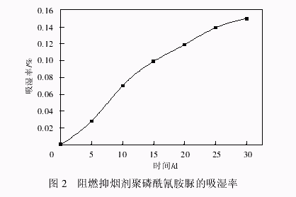 它是一集 P、N 于一体的单组分膨胀型阻燃剂。由于分子中仍保留有一定量的—NH2 基,可以与环氧树脂中的环氧基发生化学反应,因此,它是环氧树脂的反应型阻燃剂。 由于对材料抑烟、减毒的要求日益严格,使当今许多传统的阻燃剂面临困境,膨胀型阻燃剂由于其自身的优势成为目前阻燃剂最为活跃的研究领域之一,也被认为是实现阻燃剂无卤化很有希望的途径之一。但膨胀型阻燃剂的吸潮问题一直困扰着人们,为此,首先研究了所制阻燃抑烟剂聚磷酰氰胺脲的吸湿性能。 所制聚磷酰氰胺脲阻燃抑烟剂吸湿率的测试结果如图 2 所示。