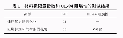 由图 2 可以看出,阻燃抑烟剂聚磷酰氰胺脲的吸湿率与放置时间基本呈线性递增的关系,但在第15 天后增加趋势趋于平缓,第 30 天的吸湿率仅为 0.15%,大大低于目前常用的膨胀型阻燃剂,并且不会对其在树脂中的分散性能、阻燃性能和抑烟性能产生任何影响。 2.2 阻燃抑烟剂聚磷酰氰胺脲的阻燃性能 为了研究阻燃抑烟剂聚磷酰氰胺脲对顺丁烯二酸酐固化的 TDE-85#环氧树脂阻燃性能的影响,测试了纯环氧树脂固化物、阻燃抑烟环氧树脂固化物的极限氧指数和 UL-94 阻燃性,结果如表 1 所示。