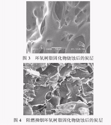 它具有不含不饱和键、炭氧比高的特点,采用顺丁烯二酸酐作固化剂,使炭氧比进一步提高。阻燃抑烟剂聚磷酰氰胺脲中大量的 P—N 键中间体是比常 规的磷化合物更佳的磷酸化试剂,它更有利于炭质泡沫层的形成,特别是对于炭氧比高的聚合物。而作为协同阻燃氮源的三聚氰胺和尿素,在燃烧时还能促进这种 P—N 中间体的形成。因此,阻燃抑烟剂聚磷酰氰胺脲可使环氧树脂酸酐固化物燃烧时生成高质量的炭层,因而具有非常优异的阻燃、抑烟效果。 两种试样烧蚀后形成的炭层的电镜照片见图 3 和图 4。