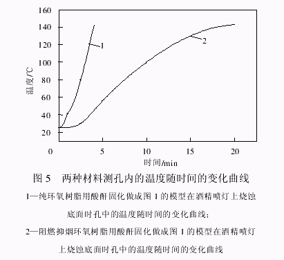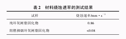由图 5 可以看出,纯环氧树脂酸酐固化物在酒精喷灯上灼烧不到 4 min,测孔内的温度已经达到150 ℃,随后整个样品燃烧,无法继续测试;阻燃抑烟环氧树脂在灼烧4 min后,测孔内的温度为51 ℃;灼烧 20 min 后,测孔内的温度为 154 ℃,隔热效果明显。测试现象显示,在酒精喷灯上灼烧时,纯环氧树脂酸酐固化物着火并冒出大量的黑烟,灼烧时间越长火势越大,样条厚度逐渐变薄;而阻燃抑烟环氧树脂灼烧时,表面成炭发泡膨胀,生成的炭质泡沫层可阻止氧气的进入和热量向内部的传递。故 4 min 时,测孔内的温度仅有 51℃,灼烧 20 min后,材料表面形成的膨胀炭层高达 4 cm,且随着灼烧时间的延长膨胀炭层越来越厚。由于生成的炭质泡沫层具有非常优异的隔热、隔氧作用,所以后期测孔内的温度上升的越来越缓慢。 对纯环氧树脂酸酐固化物和阻燃抑烟环氧树脂酸酐固化物所做的烧蚀速率测试结果也证实了这一点。纯环氧树脂酸酐固化物的烧蚀速率为 0.86mm/s,而阻燃抑烟环氧树脂酸酐固化物的烧蚀速率不到 0.08 mm/s。见表 2(测定烧蚀速率时将表面的炭层去处后再测试)。