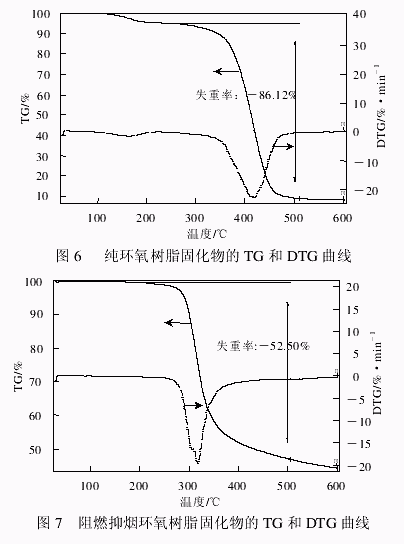 图 6 和图 7 是纯环氧树脂固化物、阻燃抑烟环氧树脂固化物的 TG 和 DTG 曲线。