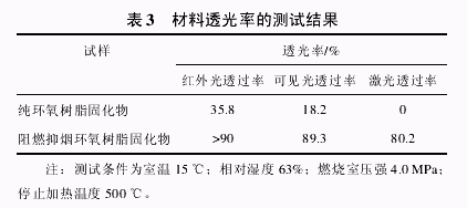由图 6 和图 7 可以看出,纯环氧树脂酸酐固化物的初始热分解温度为 346 ℃,阻燃抑烟环氧树脂酸酐固化物的初始热分解温度为 289 ℃,比纯环氧树脂酸酐固化物提前了 56 ℃;纯环氧树脂酸酐固化物 500℃时的失重率为 86.12%,阻燃抑烟环氧树脂酸酐固化物 500 ℃时的失重率为 52.50%,比纯环氧树脂酸酐固化物减少 33.62%。 造成阻燃抑烟环氧树脂初始热分解温度提前的原因在于阻燃抑烟剂先于环氧树脂分解,符合常规的阻燃原则。阻燃抑烟环氧树脂的分解温度虽有一定的前移,但残炭剩余量却由纯树脂的 13.88%提高到 47.50%,表明阻燃抑烟剂聚磷酰氰胺脲的加入提高了 TDE-85#环氧树脂的成炭能力。 2.3 阻燃抑烟剂聚磷酰氰胺脲的抑烟性能 虽然阻燃和抑烟是对阻燃材料同等重要的要求,但两者却往往是矛盾的,经阻燃处理的聚合物,其生烟量往往会增高,但本文合成的聚磷酰氰胺脲却同时具备阻燃和抑烟的功效,使两者达到了和谐统一。纯环氧树脂固化物、阻燃抑烟环氧树脂固化物透光率的测试结果见表 3。