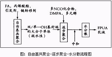 汪江节等人则采用类似于MinJiang的方法,首先由IP2DI、聚环氧丙烷二元醇、DMPA发生缩聚反应,得到异氰酸酯基(—NCO)封端的预聚物,然后用计量的乙醇和少量丙烯酸羟乙酯封端,再用TEA中和,水分散成水性PU乳液,然后再向乳液中加入丙烯酸丁酯和甲基丙烯酸六氟丁酯,以过硫酸钾为引发剂,巯基乙醇为链转移剂,在氮气的保护下发生自由基共聚,最终合成出具有核壳结构特征的PUA复合乳液。 LiGH等人报道了一种非共聚型的FPUA乳液的合成。首先用2,4-甲苯二异氰酸酯(2,4-TDI)、聚酯多元醇、N-甲基二乙醇胺为亲水扩链剂,三羟甲基丙烷作为交联剂,制备了交联型水性PU分散体,随后应用转相聚合方法,以上述制备的PU分散体为媒介,由苯乙烯、丙烯酸丁酯、2,2,3,4,4,4-六氟甲基丙烯酸丁酯在过氧化二苯甲酰(BPO)的引发下,合成了固含量为30%的水性阳离子型氟化PUA复合分散体。 2FPUA乳液的合成工艺 2.1自由基共聚合-逐步聚合-水分散流程 该法的主要流程图如图1所示。 HyejinLim等人[4]和陈建兵等人采用的就是这种工艺。在这种工艺中链转移剂起到了重要的作用,它的作用是使氟化大分子单体获得羟基,并可控制自由基共聚合产物的相对分子质量。