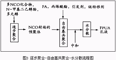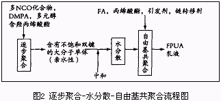 此法的特征是在自由基聚合阶段和逐步聚合阶段均采用了溶液聚合方法。 2.2逐步聚合-水分散-自由基共聚合流程 该法来源于传统PUA乳液聚合工艺,传统PUA乳液制备工艺中的种子乳液聚合法,原位乳液聚合法等均属于此流程,该法的流程如图2。