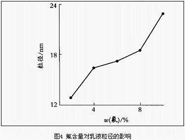 3乳液性能 乳液性能主要体现在乳液粒径的大小和乳液静置稳定性、热稳定性方面。传统PU和PUA乳液性能以及其影响因素已经被广泛地讨论,对于FPUA乳液而言,关心的焦点即是氟的引入对乳液粒径和稳定性的影响趋势和程度。 汪江节等[7]研究结果表明,在单体投料比、亲水基团含量、中和度以及分散工艺参数相对不变的情况下,随着氟含量的增加,所制备的乳液粒径迅速增大,氟含量达到一定程度,乳液变得不稳定,如图4[7]所示。