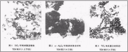 图1~3分别为3种纳米复合材料的透射电镜照片,可以看出,SiO2、TiO2在环氧树脂中分散情况良好,α-A12O3,有部分团聚体。