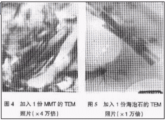 可见,随着海泡石与蒙脱土的加入,基体的玻璃化温度提高,提高的幅度最大达50℃,而与含量没有关系。由图4可见,蒙脱土呈层状剥离,形成插层纳米复合材料。通过高速搅拌,海泡石晶格破坏,形成单个的纤维,在环氧树脂中形成大网状结构,起到了纤维增强的作用,限制了高分子链的运动,从而使环氧树脂基体的玻璃化温度大幅度提高。海泡石/环氧树脂纳米复合材料的透射电镜照片见图5,由图可见,海泡石成纤维状分散于树脂中,起到了微纤维增强的作用,从而使环氧树脂的玻璃化温度提高。