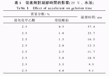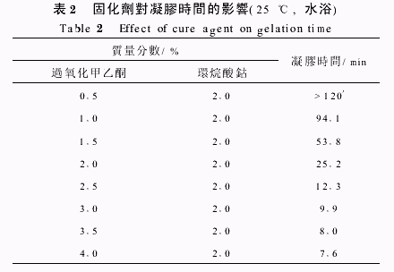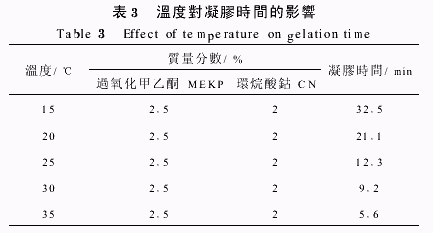 表2中可以看出,凝膠時間隨著過氧化甲乙酮加入量的增加而縮短。當加入過氧化甲乙酮質量分數低于0 5%,凝膠時間明顯延長,影響最終固化。 2 3 溫度對凝膠時間的影響從