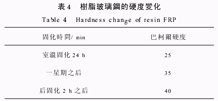 表3中可以看出,隨著溫度升高凝膠時間顯著縮短。在不同的施工溫度下應采取不同的固化劑和促進劑的添加量。 2 4 固化時間對固化度的影響 在不同的的溫度下加入質量分數為2%過氧化甲乙酮,2%的環烷酸鈷液,制成4層的玻璃鋼制品,在不同時間段測試其玻璃鋼的巴柯爾硬度變化規律。從表4中可以看出,樹脂玻璃鋼的巴柯爾硬度需要一星期才能達到35以上,采取熱固化措施能 确保固化更完全。