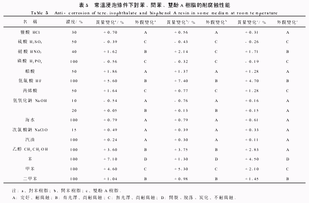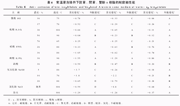2 6 2 不同樹脂在各种耐腐蝕介質中的腐蝕情況 將樹脂澆鑄体浸泡在不同濃度的化學介質中,100℃煮沸100h后測定質量和外觀的變化,見表6。