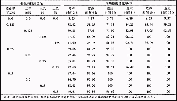 2.2催化剂种类、用量及反应时间对丙烯酸转化率的影响 研究了溴化四丁基铵,二甲苯胺、三乙胺和二乙胺等催化剂及其用量以及反应时间对丙烯酸转化率的影响,结果见表1。 表1催化剂种类、用量及反应时间对丙烯酸转化率的影响