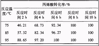 由表1可知,在一定的反应时间内,催化剂的用量对丙烯酸转化率有明显的影响。若不使用催化剂,即使反应时间延长至12h,丙烯酸的转化率也只能达到9。37%。随着催化剂用量的增加,丙烯酸的转化率明显提高,达到100%的转化率所需的时间越来越短。在催化剂用量相同的情况下,比较4种催化剂对丙烯酸转化率的影响。发现除二乙胺的催化活性稍差外,其他3种催化剂的催化活性比较接近。但溴化四丁基铵价格昂贵,而二甲苯胺具有一定的毒性,残留在改性树脂中的二甲苯胺会对操作工人的身体带来危害,因此从降低生产成本和安全生产的角度考虑,使用三乙胺作催化剂较好。三乙胺用量为0。5g时,反应在6h内就可完成;三乙胺用量为0。25g时,反应要8h才能完成。多用0。25g三乙胺可节省2h反应时间,而成本增加不多,且6h反应时间最有利于工业生产单班的控制,同时考虑热能的消耗、劳动费用等综合因素,三乙胺的用量以0。5g为宜。 2.3反应温度对丙烯酸转化率的影响 三乙胺用量为0。5g时,考察不同温度对丙烯酸转化率的影响,结果见表2。 表2反应温度对丙烯酸转化率的影响