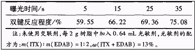 由表2可知,用三乙胺作为催化剂,在同一反应时间内,随着反应温度的升高,丙烯酸的转化率提高。在温度为95℃时,丙烯酸可在6h之内反应完全。因此从工业生产的角度看,较高的反应温度有利于缩短生产周期,提高生产效率。 2.4产品的光化学活性 产品光化学活性用曝光后双键的相对反应程度来表示,结果见表3。 表3产品的光化学活性