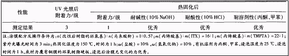 由表3可看出,在未加入交联剂的情况下,丙烯酸改性F-44树脂具有较为理想的光反应活性。在光照5s时,双键反应程度就接近60%。这证实,所合成的产品是一种光敏性树脂,所制得的涂料可通过光交联成膜。 2.5产品的性能 光敏酚醛环氧丙烯酸酯是F-44树脂中部分环氧基与丙烯酸进行了化学反应,改性后的树脂中仍然保留一部分环氧基,这部分环氧基使树脂制备涂料时有优异的力学性能,例如对底材优良的附着力等。为保证这部分环氧基充分地参与固化反应,在树脂中加入马来酸酐作为环氧基的热固化交联剂,其用量取决于环氧基的剩余量。光敏剂和TMPTA的用量根据改性后树脂中双键的含量决定,结果见表4。从表4可知,经热固化后的涂漠具有优良的附着力、耐酸碱性和耐溶剂性等性能。 表4涂膜性能