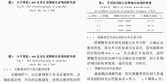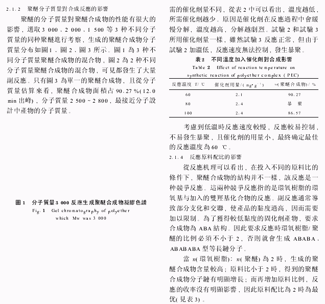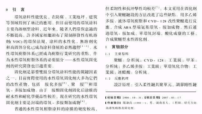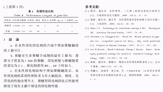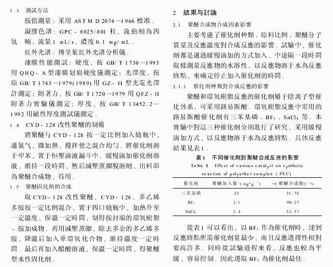 128改性聚醚鏈段,合成聚醚型水性固化劑,實驗表明工藝可行。對CYD-128改性聚醚合成過程中各影響因素進行了研究,并對聚醚水性固化劑固化性能進行了評价。最佳配方与工藝為:選擇分子質量為1500的聚醚,環氧樹脂与聚醚物質的量比為2︰1,催化劑選用BF3(60℃時加入)。与現有文獻中報道的固化物性能相比,水性固化劑固化環氧体系的的柔韌性和附著力有大幅提高,硬度、光澤度和強度改變不大。 關鍵詞:多乙烯多胺;聚醚;水性固化劑;環氧樹脂