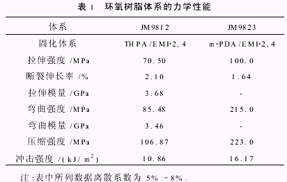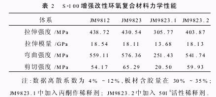 为改善工艺性能,分别用活性稀释剂及非活性稀释剂稀释间苯二胺固化体系,用高强型平纹-100玻璃纤维织物(S 100)作增强材料,压制复合材料板材并加工制备拉伸、弯曲、剪切性能试样,进行性能测试,结果见表2。