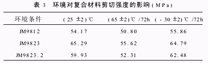 复合材料拉伸性能主要由纤维性能决定,此外与基体材料断裂伸长率有关;基体材料性能对复合材料的弯曲性能和剪切性能影响较大;复合材料性能的优劣还取决于界面粘接状况[2]。由表1看到,JM9812和JM9823体系的基体断裂伸长率分别为2.10%和1.64%,酸酐固化体系的韧性较好,而其他的力学性能均低于间苯二胺固化体系。由表2看到,S 100/JM9823体系复合材料的剪切强度明显高于S 100/JM9812体系复合材料。但是该体系的工艺性较差,为改善JM9823体系的工艺性,分别加入活性和非活性稀释剂调节黏度,使体系工艺性得到一定程度的改善,但力学性能下降,尤其JM9823.1的强度下降了30%~65%。这可能是胶层中有残留的稀释剂所导致。 2.3 湿热环境下的力学性能 用无碱玻璃纤维织物(EW 200)增强JM9812、JM9823体系的复合材料试样,在(-30±2)℃、(65±2)℃,RH60%条件下恒温72h,测得的剪切强度试验结果见表3。 由表3可见,3种复合材料在60~70℃的剪切强度比常温条件下低,但强度仍保持在80%以上,尤其是JM9812体系相对室温强度保留率为93.78%。这说明复合材料耐温性好。主要是由于改性树脂体系中三官能度环氧树脂TDE 85与双酚A环氧树脂交互作用,使交联密度增大而且分布均匀,固化物结构紧密。温度较低(-30℃)时剪切强度还略有提高。由此可见,加活性稀释剂的复合材料随环境变化力学性能改变不大。