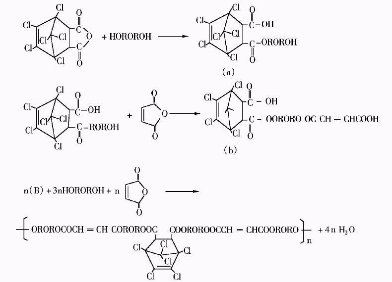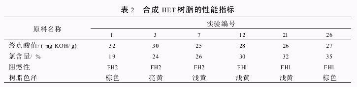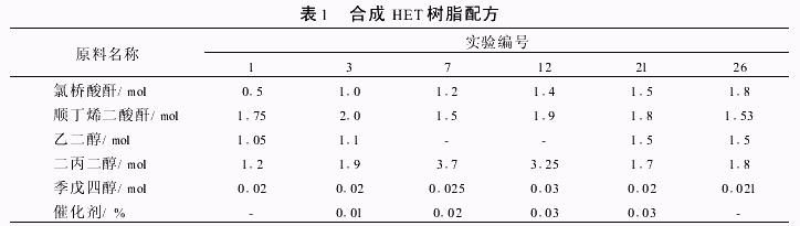 交联固化反应:链上的双键与苯乙烯产生交联反应,形成网状结构的树脂. 1 .2 .2 树脂结构特征 特殊的分子结构决定树脂的优异性能.海特隆不饱和聚脂是由氯桥酸酐代替部分二元酸与二元醇或多元醇缩聚而成的,氯桥酸酐中含54%的稳定氯是树脂具有持久阻燃性,两个相连的五元环结构赋于树脂优良的耐热性,树脂分子中存在大量的甲基支链,造成酯链的空间位阻大,降低了酯键的水解性,提高了树脂的稳定性.具备空间结构的多环基团,扩大了空间效应;尤其是多环基团基本被Cl饱和,使得该基团上的一个双键在聚酯反应条件下都没有活性,可以看成是一个饱和的多环基团.再加上分子中的醚键,使氯桥酸酐树脂具备优良的抗化学性,即耐腐蚀性能.较长的直链容易制塑性大分子.直链上的双键是可以反复交联的活性基团,与苯乙烯固化后,生成分子量很大的空间网状结构,具备优良的机械性能.分子中存在的大量卤素,不仅增加了树脂的稳定性和耐腐蚀性,同时提高了树脂的阻燃性. 1 .3 合成实验 1 .3 .1 树脂合成 合成HET树脂配方及性能指标见表1、表2.