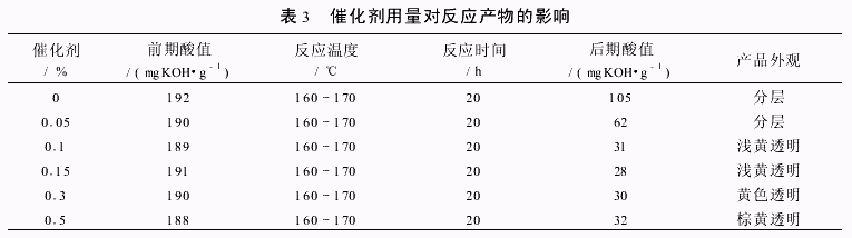 2 .2 固化条件的选择 所合成的树脂在适当的温度下,选用不同的促进剂引发剂体系,不同浓度和配比进行实验,表明以过氧化苯甲酰作引发剂,环烷酸钴作为促进剂的体系,对树脂具有较好的固化效果,促进剂和引发剂的用量分别是树脂质量的2 3%~2 5%和1 5%~2 0%.在50~60℃固化45h,80~100℃固化20h,固化条件直接影响海特隆不饱和聚脂树脂的性能. 2 .3 催化剂用量 加入适量催化剂可以缩短酯化时间,但量过多会影响树酯性能.后酯化阶段也可以通过出水量来判断反应进程.选用催化剂M,并用不同的催化剂量进行对比实验,结果见表3.由表3可知,在相同的反应温度和反应时间下不加催化剂或催化剂量少,反应不好,产物分层.催化剂过多对反应也不利,适宜的催化剂量0 1%~0 25%.