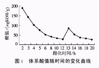 1 .3 .2 操作过程 1)装有搅拌器,回流冷凝器和温度计的聚酯釜中加入乙二醇,二丙二醇,催化剂,用氮气作为保护气,加热至一定温度后分批加氯桥酸酐和半份顺丁烯二酸酐,搅拌升温反应. 2)升温到145~150℃时进行反应2h,160~170℃反应8h,冷却至120℃再加入另一半顺丁烯二酸酐和季戊四醇,再升温至170~180℃反应6h,减压脱水,出水至测量酸值30以下,反应结束,加入对苯二酚. 3)降温至100~110℃,加入苯乙烯和紫外吸收剂,于85~90℃搅拌均匀,放料冷却,得成品树脂. 1 .3 .3 酸值测定 反应体系及产品酸值测定,按国家标准GB2895 87酸值测定法. 1 .3 .4 不饱和树脂的固化 固化时,加入过氧化苯甲酰1%,固化剂和促进剂适量,搅拌均匀后倒入模具中固化. 1 .3 .5 手糊成型法海特隆不饱和聚脂玻璃钢 玻璃钢制品铺层:1层玻璃纤维毡+(6~8层)短切毡和粗纱+1层粗面纱,厚4~5mm,玻璃钢含胶量65%~75%,阻燃协同剂为5%Sb2O3和适量填料,按一般手糊成型法海特隆不饱和聚脂玻璃钢在50~60℃固化65h,再在80~100℃固化20h,得自熄性玻璃钢. 2 结果与讨论 2 .1 反应时间对酸值的影响 酸值的大小反映了树脂中游离酸和分子终端的羟基数量,随着聚酯反应的进行,游离酸和终端羧基不断减少,酸值下降.反应进行得越完全,体系的酸值越小.图1给出了一组聚酯制备过程中体系酸值随反应时间的变化情况.在反应前半阶段,初期酸值较高,酯化速度较快,随着反应进行,酯化速度变慢,当酸值降至30以下时,基本完成前期酯化,前期酯化结果对树脂性能有重要影响.