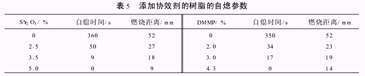 由表4可知,160~175℃为适宜的反应温度,反应温度降低,反应活性下降,温度低于130℃时,反应不能顺利进行,反应温度过高也有害,实际当温度高于190℃时,产品聚酯色度深,副产物增多,树酯性能降低. 2 .5 树脂的性能 按上述方法合成的树脂,检测其性能为:浇铸体产品抗拉强度≥38ΜPα冲击强度≥4ΜPα,热变形温度≥120℃,手糊成型法海特隆不饱和聚脂玻纤增强玻璃钢产品的抗拉强度≥120ΜPα弯曲强度≥140ΜPα,热变形温度≥135℃,热煮24h吸水量<0 1%,可见此类树脂及其玻璃钢制品优越性能. 2 .6 协效剂对树脂阻燃性能的影响 氯桥酸酐代替二元酸合成的不饱和聚酯树脂,当氯含量大于30%时,不需要添加其它协同阻燃剂树脂就能自熄.低于30%时添加适当阻燃协效剂也能达到较好的阻燃效果,可使用的协效剂有多种,Sb2O3和含磷阻燃剂都是较好的协效剂.表5给出了含氯量25%海特隆不饱和聚脂,分别添加Sb2O3和甲基磷酸二甲酯(DMMP)的自熄时间和燃烧距离的测定结果.