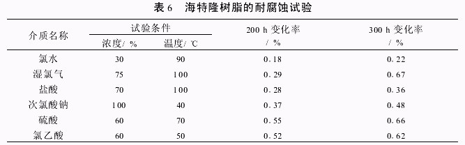 加入量约5%Sb2O3或3%甲基磷酸二甲酯就能达到离火后很快自熄.当含氯量低于18%时,海特隆不饱和聚的阻燃性大大降低,此时添加其它协同阻燃剂改善效果有限. 2 .7 树脂的耐腐蚀效果 将制成的不饱和树脂进一步制成浇铸体,进行耐腐试验,部分结果见表6.可以看出,该树脂具有高度耐腐蚀性,尤其是对含湿氯气及其它含氯介质的场所,具有良好的耐腐蚀性.