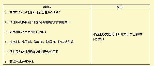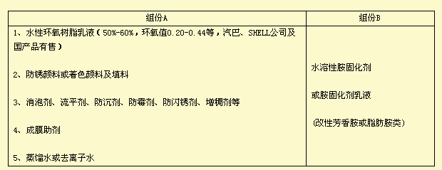 该型产品特点(主要和Ⅱ型相比): *双组份混合搅拌时充分乳化,对混合搅拌剪切速率有一定要求; *固体份较高,零VOC排放; *因完全靠反应干燥,表干较慢,尤其是低温(15℃以下)时; *混合后使用期很短,一般约15-30分钟(25℃),在加入较大量冰醋酸的情况下也最长不易超过2小时(25℃),而加入冰醋酸会导致漆膜机械性能降低。超过使用期后使用易出现漆膜针孔和无光(面漆)等现象。 ②、Ⅱ型,乳化型:最大特点是使用环氧树脂乳液和水性固化剂(乳液或溶液) 该型水性环氧防腐涂料由分子量较高的水性环氧树脂制成的乳液和水溶性胺固化剂或固化剂乳液组成,水性环氧固化剂(乳液或透明溶液)与环氧树脂乳液具有较好的相容性,它不要求具有乳化作用。该型大都含有少量有机溶剂作为成膜助剂(一般不超过10%)。由于水性环氧涂料的涂膜是由环氧树脂和固化剂交联反应而生成的网状结构,所以涂膜具较好防腐蚀性、耐化学品性及机械性能。 Ⅱ型水性环氧防腐涂料典型配方组成: