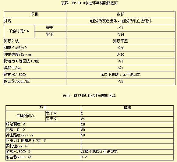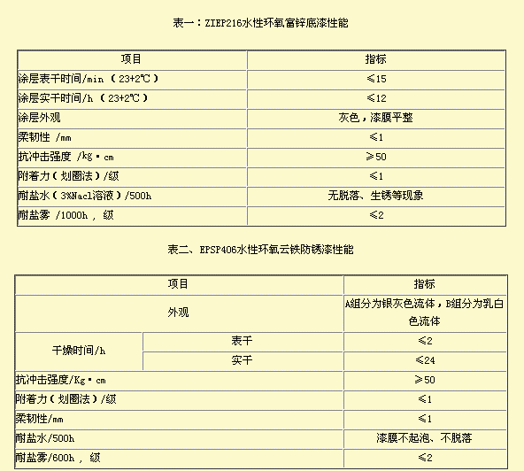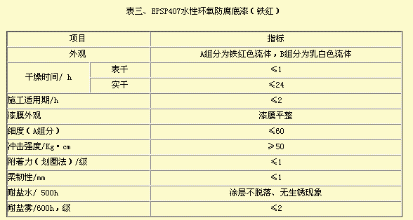 三、水性环氧防腐涂料的性能 水性环氧防腐涂料在国内应用的历史并不长,如果采用进口环氧乳液和固化剂,成本很高,与溶剂型环氧防腐涂料产品相比,价格上差距较大。现在国内水性环氧乳液和固化剂产品日趋成熟,产品成本有所下降了,令人头痛的乳液的贮存稳定性难题被一些乳液生产厂家逐步解决,这给水性环氧防腐涂料的推广应用带来福音。 就我们在研发过程中的一些试验数据来看,在良好涂装环境条件下制好的板,涂层性能还是很接近溶剂型环氧漆的。当然,这种制板是在理想涂装环境下进行。 以下是我们测试的水性环氧防腐涂料的产品性能指标: