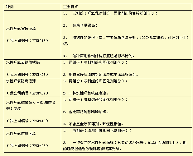 该型产品特点(主要和Ⅰ型相比): *搅拌均匀后即可使用; *固体份不是很高,有一定VOC排放; *采用高分子量环氧乳液,表干较快,水挥发即可表干; *混合后使用期较长,一般能达到2小时(25℃)以上,最高能达到6小时,能满足施工操作要求。 目前市面上的水性环氧防腐涂料以Ⅱ型产品为主,但不排除有的厂家有Ⅰ型产品推广应用。 2、 按所用防锈颜料分类 按所用防锈颜料及涂料功能的不同,可分为以下品种: