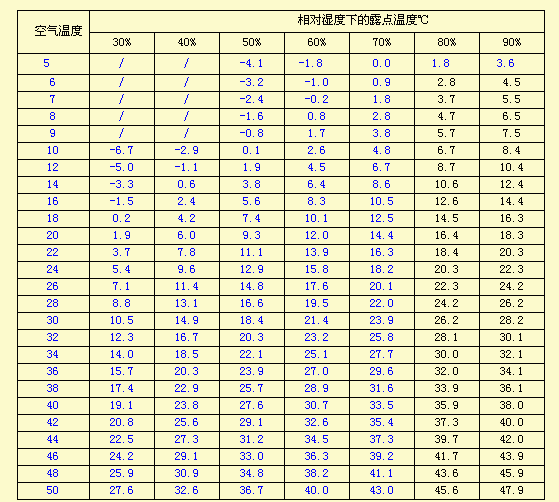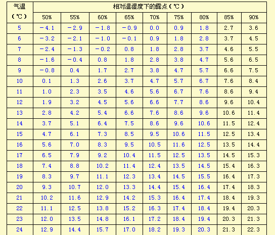 如果要达到底材温度高于露点5℃以上,则为下表蓝色部分。