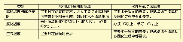 B、底材温度 低温时,对于溶剂型产品可通过选用挥发快的溶剂来解决溶剂挥发速度问题,但对水性环氧防腐涂料来说,并没有有效的解决水挥发速度下降的问题。 C、空气湿度 高湿度空气中水份含量高,对水性漆膜中水份逸出漆膜到空气中的速度比溶剂从溶剂漆中逸出的速度影响更大。 D、空气流动状况 空气流动越快,水蒸发越快,这对溶剂型和水性产品是相同的。 因而,水性环氧防腐涂料应该比溶剂型产品要求更高的涂装环境条件,主要表现如下: